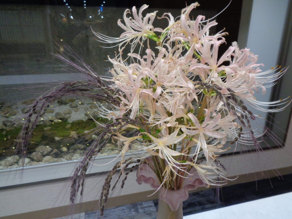 お彼岸のころ 突然 姿を現す曼珠沙華 淡いピンク色も素敵ですね。赤米の稲穂とともに 活き活きと。