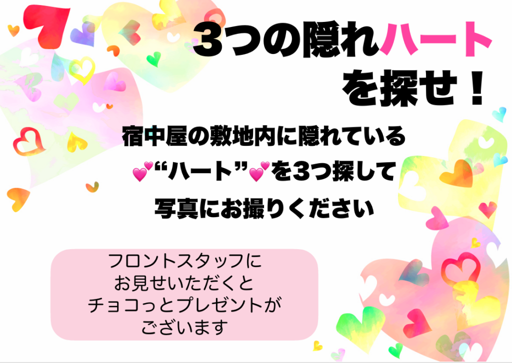 宿中屋館内にある「隠れハート」を3つ探して写真にお撮りください。